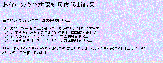 選んだ答えによって、「否定的自己認知」「対人認知」「強迫的思考」の傾向の強さを表示します。また総合得点でも評価します。』